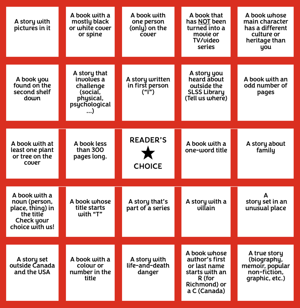 • To earn one square, sign out a book you’ve never read before from the SLSS Library, finish it, bring it back, and ask us to stamp your bingo card.